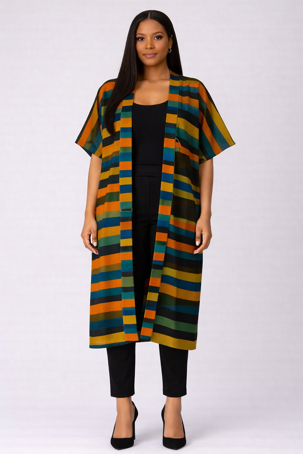 This eye-catching open-front kimono features bold horizontal stripes in rich tones of orange, teal, green, and mustard, reflecting a perfect fusion of African-inspired artistry and modern sophistication.