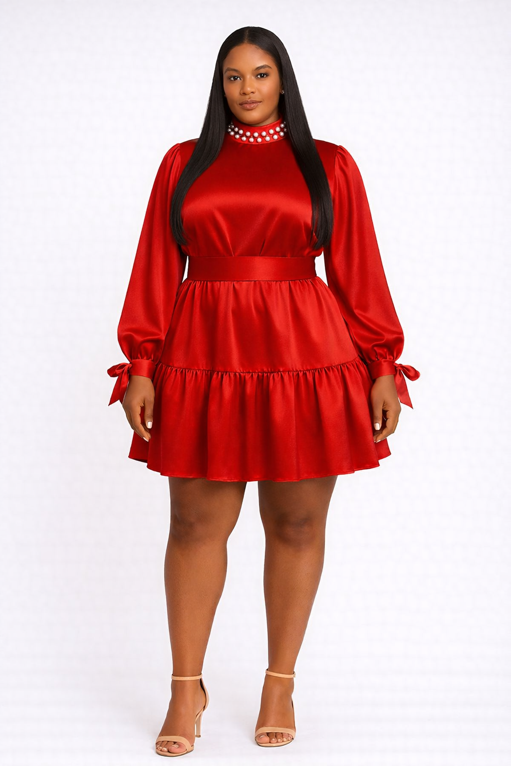 Crafted from luxurious satin fabric, this dress combines soft texture with a structured silhouette. The pearl-embellished high neckline adds a touch of royalty, while the tiered hem and puff sleeves create graceful volume.